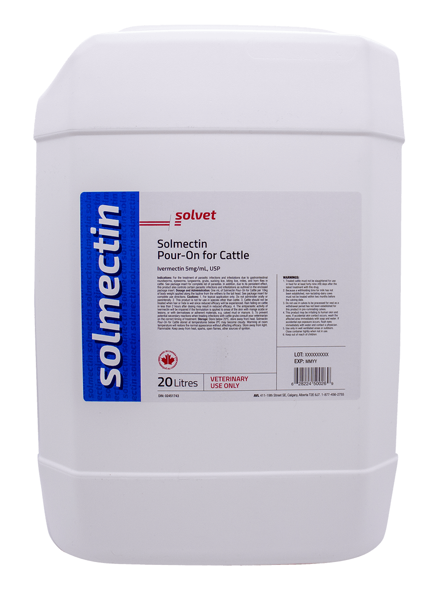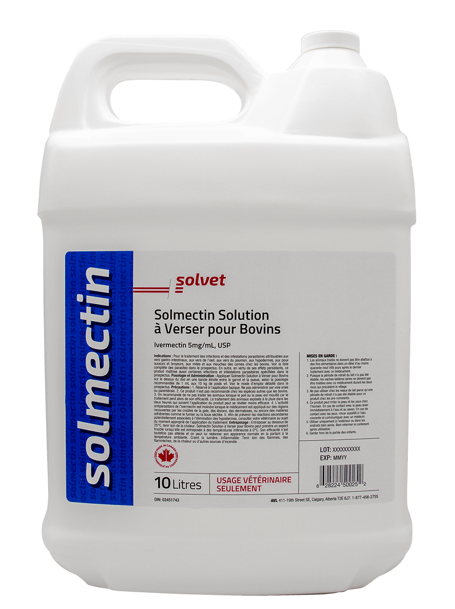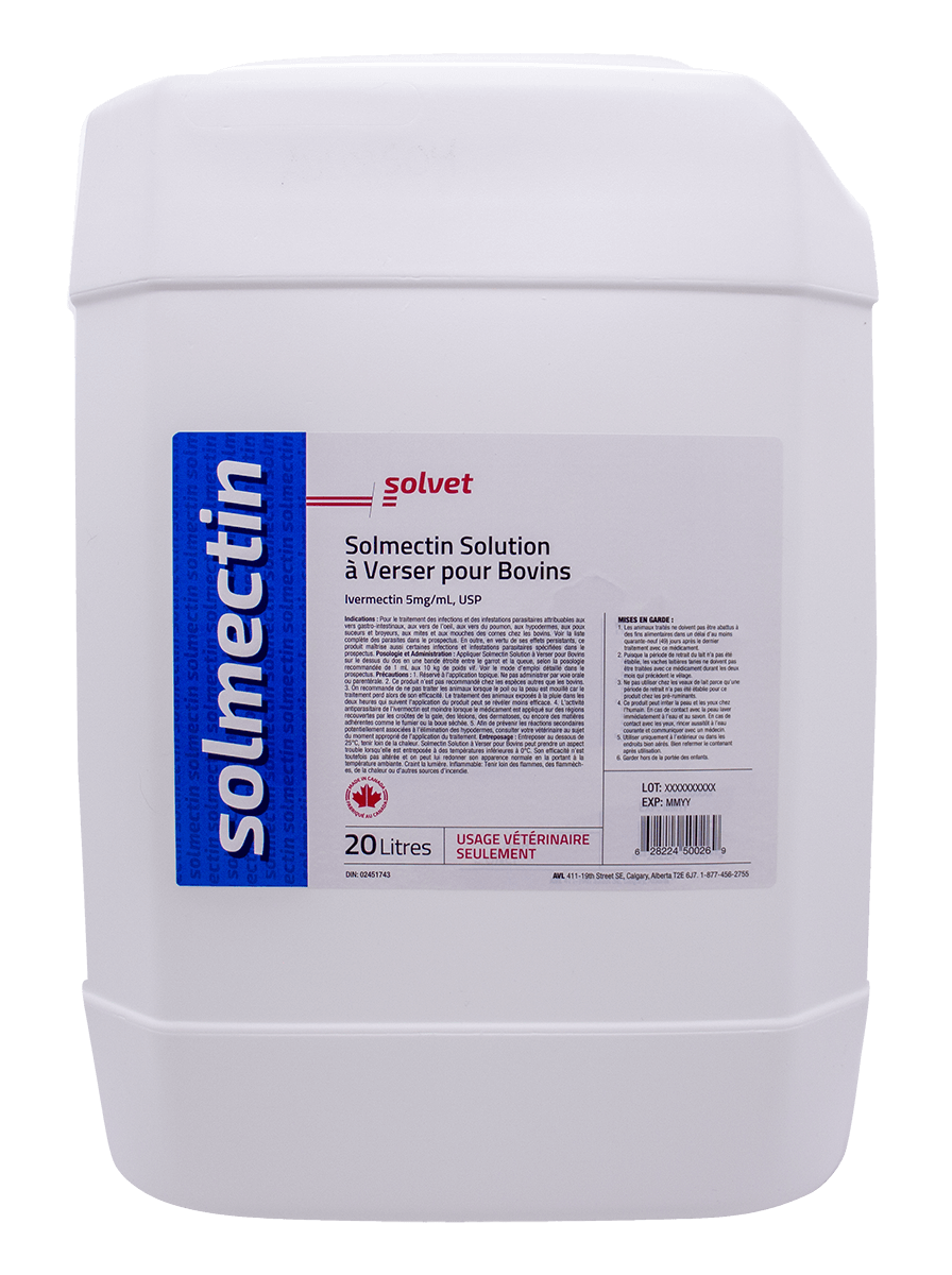 Le seul vermifuge à verser canadien, fabriqué par des Canadiens pour des Canadiens. Les clients ont demandé plusieurs formats pour répondre aux besoins des petits et des grands producteurs. Solvet a répondu en proposant un choix de quatre formats. Administrer selon les recommandations de votre vétérinaire. Consulter la monographie du produit pour connaître les propriétés, les allégations, les indications et les conditions d’utilisation.